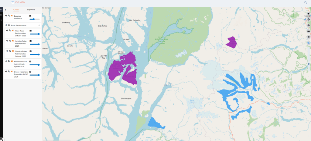 Este Visor de mapa muestra información referente a la IDE MBN, ya sea de rutas patrimoniales, propiedad fiscal administrada y bienes nacionales protegidos